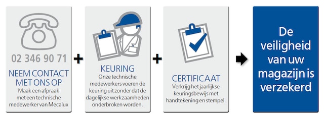 Volgens de Europese norm NBN EN 15635 met betrekking tot «Stalen opslagsystemen – Gebruik en onderhoud van opslagapparatuur» valt de uitvoering van de jaarlijkse keuring onder de verantwoordelijkheid van de gebruiker van het magazijn. Deze keuring moet uitgevoerd worden door een gekwalificeerd persoon.