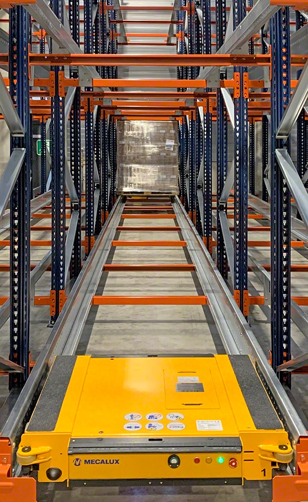 Mecalux installeerde 29 meter lange en 8 meter hoge magazijnstellingen, die voorzien zijn van een semi-automatisch Pallet Shuttle-systeem. De oplossing beslaat slechts 350 m² maar levert een opslagcapaciteit voor 1120 pallets.