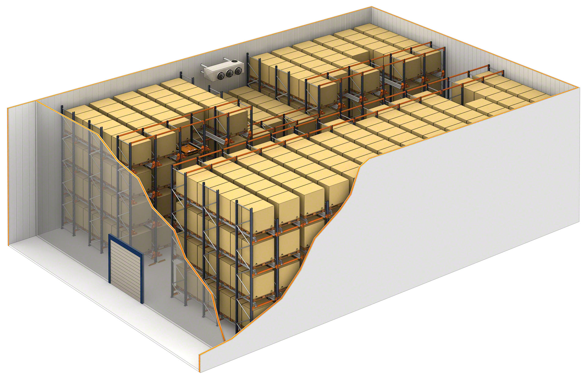 - Kostenbesparend: aangezien de ruimte optimaal benut wordt, kan het vloeroppervlak worden beperkt. Zo bespaart u op investeringskosten en in koelruimten wordt de te koelen oppervlakte en dus het energieverbruik verminderd.