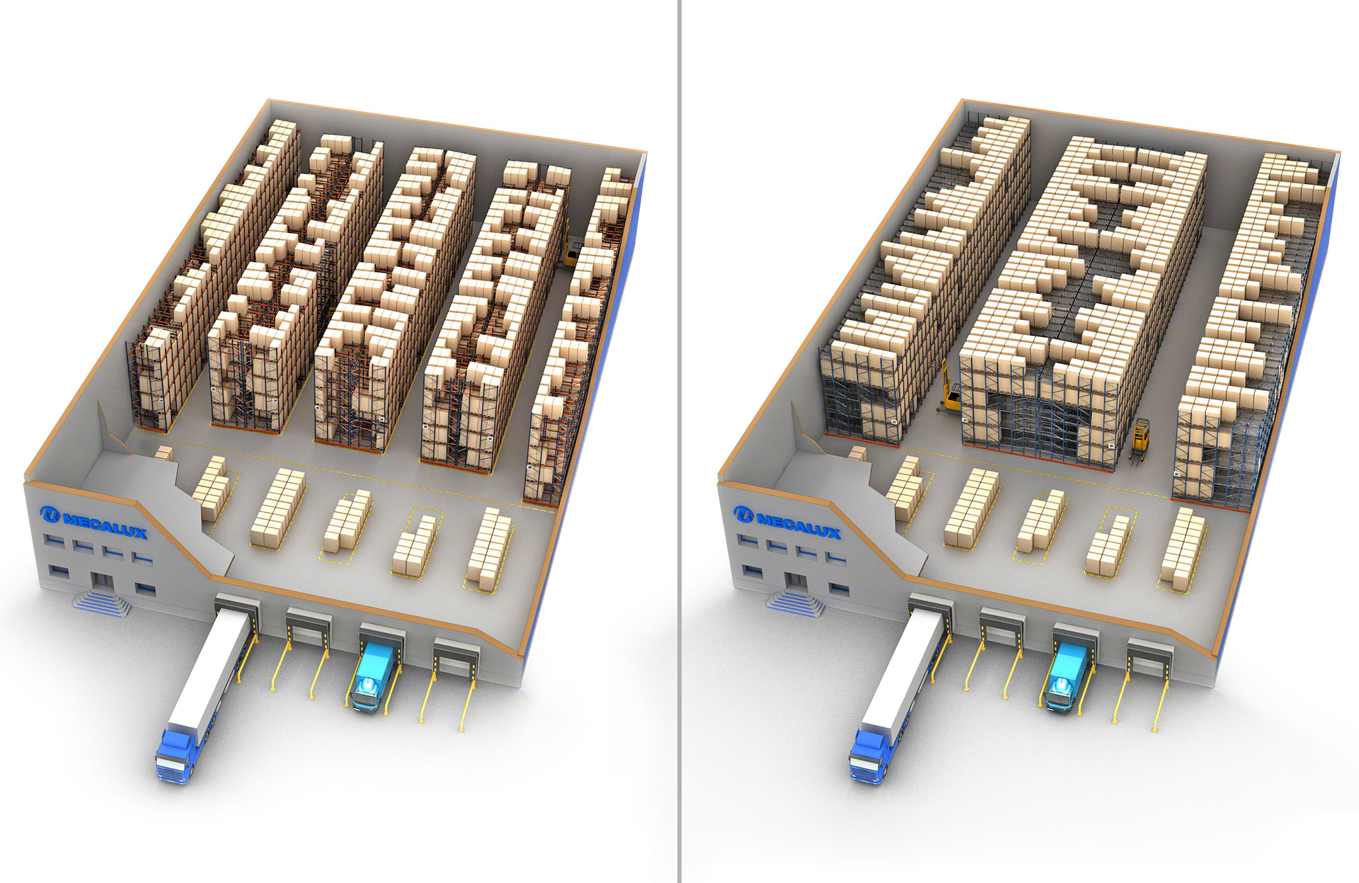 Pushback stellingen zijn een zeer eenvoudig opslagsysteem met groepering, waarbij in elk kanaal een ander SKU kan worden ondergebracht. Vorkheftrucks hoeven niet tussen de stellingen door te rijden, aangezien zij de goederen in het gangpad afzetten en eruit halen. Hierdoor worden de manoeuvretijden verkort en de operationele veiligheid verhoogd. Deze stellingen worden echter beperkt door de diepte van de kanalen en de hoogte. Het systeem kan worden ingericht met maximaal vier en zes pallets diep (afhankelijk van de gekozen variant, geleiders of rollen) en met een maximale hoogte van 7,5 m. Als een grotere capaciteit en hoogte vereist zijn, heeft Mecalux ook andere oplossingen voor opslag met hoge dichtheid, zoals het Pallet Shuttle systeem, waarvan de kanalen bijvoorbeeld meer dan 40 m diep kunnen zijn.