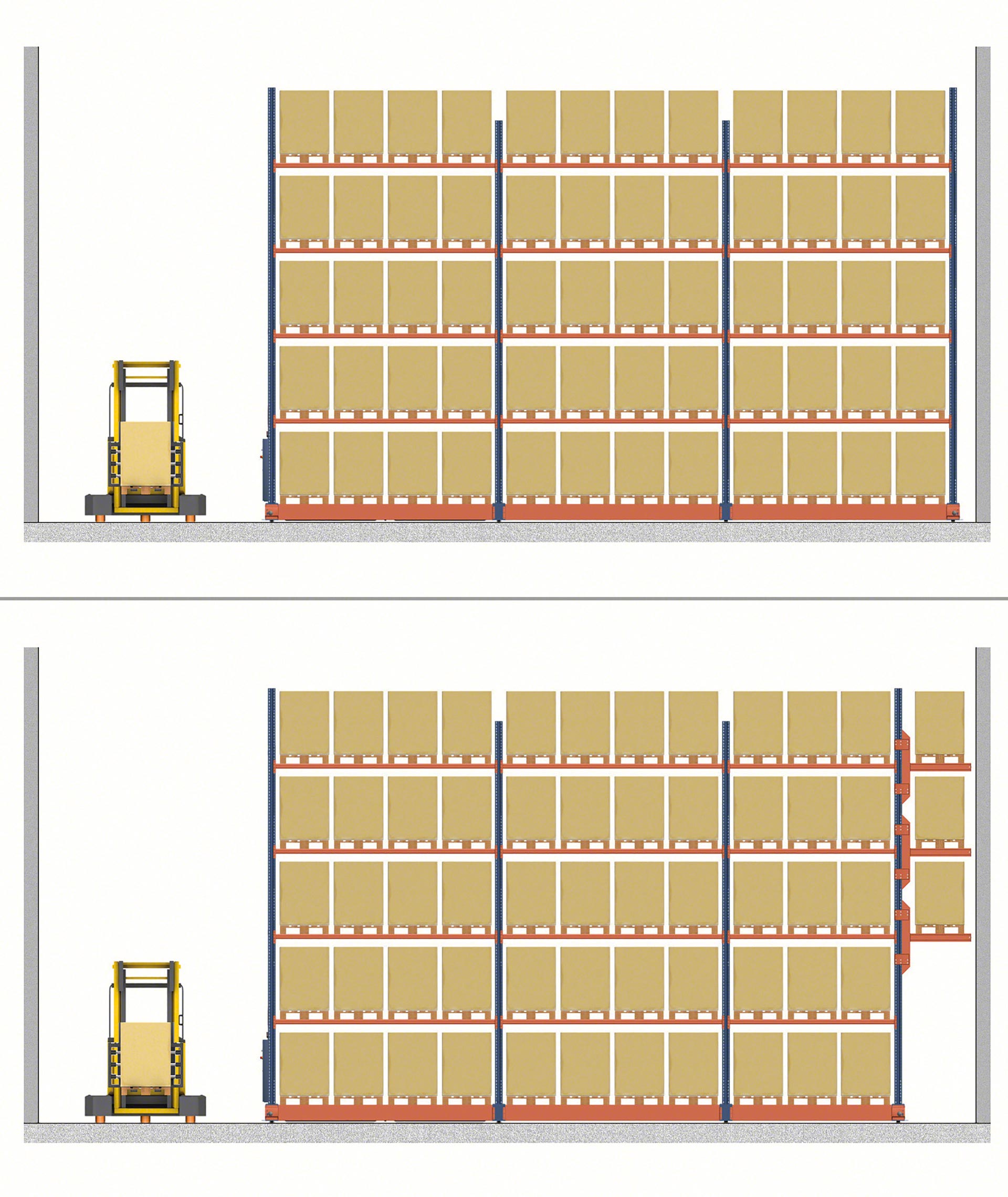 Dit is een beslissing die in de ontwerpfase moet worden genomen. Bij maximale groepering wordt er met slechts één gangpad voor vorkheftrucks gewerkt. Als de klant dat wenst, kunnen er echter meerdere gangpaden tegelijk worden geopend. Dit gaat dan wel ten koste van het aantal verrijdbare onderstellen en dus van de opslagcapaciteit.